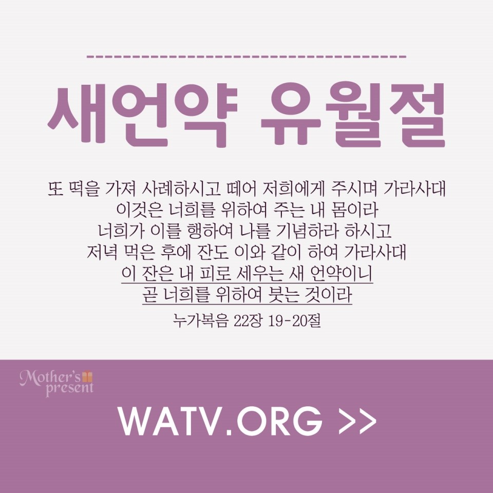 새언약이니 이것을 행하여 마실 때마다 나를 기념하라 하셨으니 너희가 이 떡을 먹으며